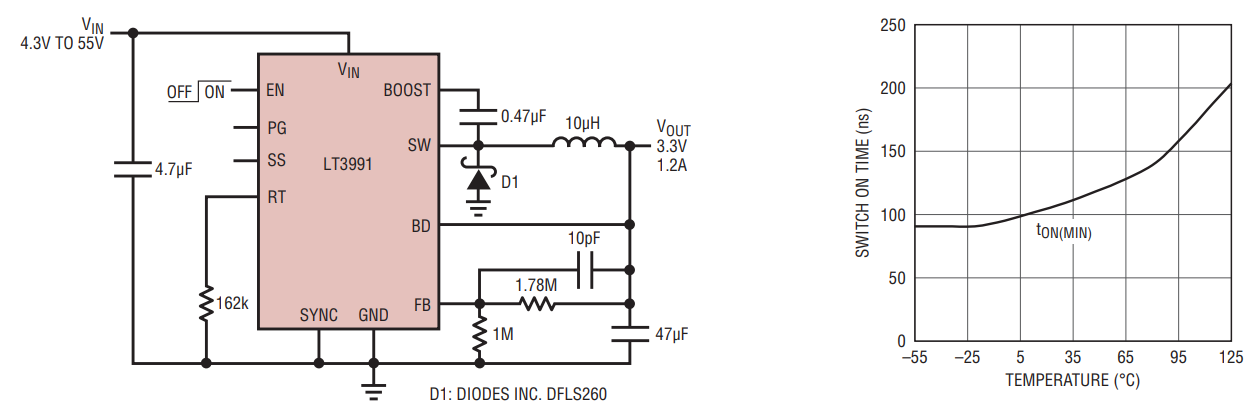 The LT3991 has a typical minimum switch on time of 110ns at room and 150ns at 85°C, which allow higher switching frequencies for large step-down ratios when compared to other parts with similar high input voltage ratings. Figure 8 shows a 48V input to a 3.3V output application with a switching frequency of 300kHz. The 10µH inductor and 47µF output capacitor yield a small overall solution size. The output capacitor can be a small ceramic capacitor, as opposed to a tantalum capacitor, because the LT3991 does not need any output capacitor ESR for stability.