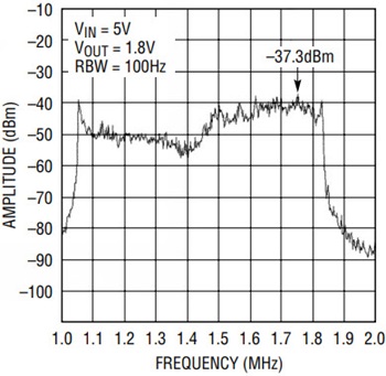 a. The LTC3415’s output noise spectrum analysis in free-running constant frequency operation.