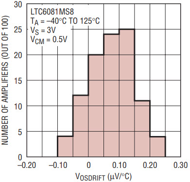 Bipolar amplifiers can have low offset and low offset drift, but their nA level input bias current make them inappropriate for high input impedance applications such as photodiode amplifiers. CMOS amplifiers usually offer inferior offset drift, CMRR, and PSRR specifications and therefore are not suitable for precision applications. Chopper stabilized amplifiers, also known as zero drift amplifiers, can achieve superior offset and offset drift by means of offset cancellation, but have clock noise and fold-back noise due to sampling. LTC6081 and LTC6082, however, are continuous time CMOS operational amplifiers, which use a patented methodology to improve their offset voltage, offset voltage drift and CMRR. They combine the features of low input bias current, low offset drift and low noise.
