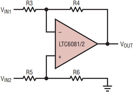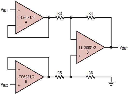 Figure 3 is a reduced circuit of Figure 2 with a unity gain buffer at the front stage. This circuit can achieve rail-to-rail input range. As mentioned previously, it won’t have the high CMRR of the circuit in Figure 2 since we reduced the front stage gain to unity. If the input resistance requirement can be eased, Figure 3 can be reduced to Figure 4, a single stage difference amplifier. The impedance of the non-inverting and inverting inputs are R3 and R5 + R6, respectively. An obvious advantage of the LTC6081 is its super low input bias current. Even with a 1MΩ input resistor R3 or R5, the less than 1pA input bias current of LTC6081 will add less than 1µV to VOS.