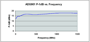 Two other important RF switch specifications are related to the power levels that the switch can handle. The first is the 1 dB compression point, P1dB, which is the RF input power level at which the switch insertion loss increases by 1 dB over its low-level value. P1dB is a measure of how much power the on switch can handle before it will distort or compress the signal, and is therefore a measure of the RF power handling capability. Next, when closely spaced tones are passed through a switch, the nonlinearity of the switch causes false tones to be generated. The input third order intercept point, IIP3, is a measure of the power in these false tones and is directly related to the amount of distortion caused by the switch. Figure 3 shows the P1dB compression point versus frequency. In this case, P1dB at 1 GHz is 17 dBm. The IIP3 for this switch at 900 MHz is 33 dBm, making it well-suited for medium power, high frequency applications, including IF switching in cellular handsets that employ GPS or other enhanced functionality.