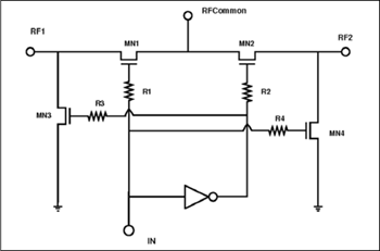 In recent years, GaAs switches have dominated the wideband switch market due to their low DC power consumption (compared to PIN diodes). GaAs switches are made up of arrays of transistors that act as voltage-controlled resistors. The GaAs transistor is a three-terminal device; the gate voltage (Vg) controls the resistance between the other two terminals. To increase isolation between RF ports, they can be connected in series or as shunt devices to ground. Unlike PIN diodes, the placement of multiple transistors in series actually aids RF power-handling and linearity, with little effect on insertion loss. A typical TX/RX switch schematic is shown in Figure 5. Here, transistors are connected in a series-shunt configuration to obtain the optimum insertion loss and isolation performance. The drawback of this configuration is that complementary switching of MN1/MN4 and MN2/MN3 requires that both high and low logic levels be available simultaneously, increasing the complexity of the control circuitry and thus the cost.