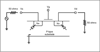 As was stated previously, CMOS switches are suitable for many low-power applications. Their power handling capability is reduced as frequency is reduced for two reasons: first, the inherent NMOS structure as shown in Figure 6 consists of two regions of N-type material in a P-type substrate, which leads to parasitic diodes being formed between the N and P regions. When an AC signal, biased at 0 VDC, is placed on the source of the transistor, and Vgs is such that the transistor is turned on, the parasitic diodes can be forward-biased for some portion of the negative half cycle of the input waveform. Once the input sine wave goes below approximately –0.6 V, the diode will begin to turn on. This will cause the input signal to be compressed. At low frequency, the input signal is below the –0.6 V level for longer periods of time, thus having a greater impact on the 1 dB compression point (P1dB). The second mechanism is the partial turn-on of the shunt NMOS device when it is supposed to be off. As was mentioned previously, the NMOS transistor is in the off state with Vgs < Vt. With an AC signal on the source of the shunt device, there will be a time in the negative half cycle of the waveform where Vgs ≥ Vt, thereby partially turning on the shunt device. This will cause the input waveform to compress by shunting some of its energy to ground. Both of these mechanisms can be overcome by applying a small DC bias (~0.5 V) to the RF input signal when the switch is being used at low frequency (<30 MHz) and high power (>10 dBm). Unlike GaAs switches, DC blocking capacitors are not required with CMOS switches.