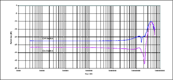 Off isolation is defined as the attenuation between input and output ports of the switch when the switch is off. Figure 2 shows a typical plot of off isolation versus frequency. High isolation is demanded for most wideband switching, and is generally a critical specification in determining if a part is suitable for a particular application.