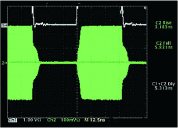 Switching time is also excellent, with CMOS switches featuring a typical switching time of 5 ns—up to ten times faster than many GaAs parts. Figure 8 shows the 5 ns switching time of a typical ADG901. The timing specifications of this part at extreme temperature conditions are 8 ns maximum, compared with microseconds for many