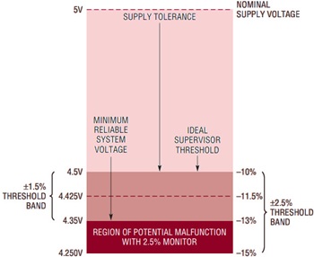 The system must work reliably down to the low end of the threshold band or risk malfunction before a reset signal is properly issued. In our 5V example, the system ICs must work down to 4.35V with a 1.5% accurate supervisor. The same system using a ±2.5% accurate supervisor must operate down to 4.25V, which is 15% lower than the nominal supply voltage, increasing the required system voltage margin and the probability of system malfunction.
