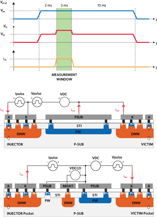 Figure 8. HS injection latch-up test waveform in a wafer-level setup for the pocket-to-pocket voltage VPK-PK, injector voltage VINJ and current IINJ (a). Cross-sections of the latch-up test structure and test setup components for HS hole injectors (b) and LS electron injection (c).