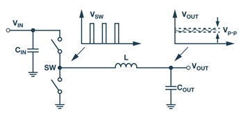 图1所示为典型的降压稳压器。两个开关交替接通和断开,因此SW节点电压VSW是一个理想的方波,此特性进而传递到占空比和输入电压。VSWVSW可以用下面的公式表示: