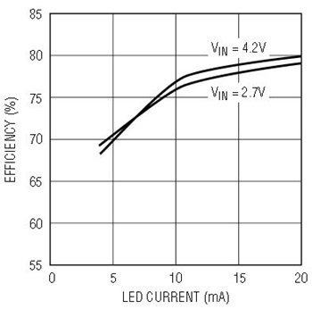 The circuit in Figure 1 is a common choice for many portable devices, driving four white LEDs from a single Li-Ion cell with efficiencies reaching 80%. Figure 2 shows that the efficiency remains high over the full voltage range of the battery and over the entire range of LED current. As shown, dimming is accomplished using a DC voltage, but logic-controlled or PWM-controlled dimming can also be used. Consult the LT1932 data sheet for detailed information on LED dimming. The overall simplicity of the LT1932 solution can easily be seen in Figure 1, as only a few external components are needed to provide a complete LED driver.