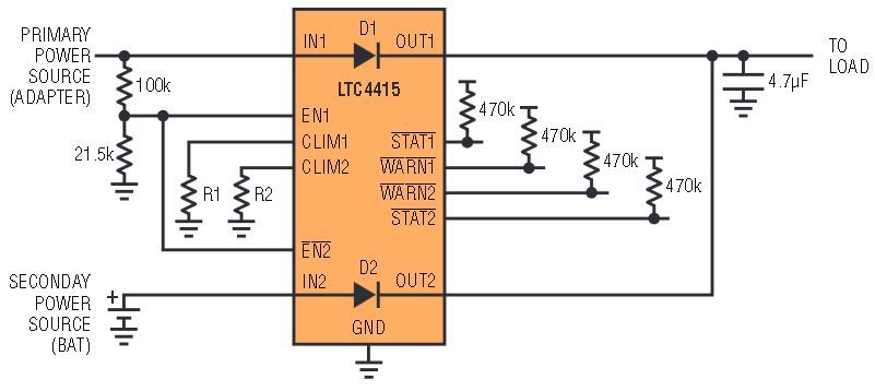 The LTC4415 efficiently and intelligently switches between two power sources in an input voltage range of 1.7V–5.5V. When used in the diode-OR application as shown in Figure 1, LTC4415 delivers load current through ideal diode D1 from the wall adapter until its voltage drops below the 4.5V switchover threshold set by the resistor divider on EN1/EN2. Once D1 is disabled, the battery delivers load current through D2 instead. STAT1 and STAT2 indicate which ideal diode is conducting.