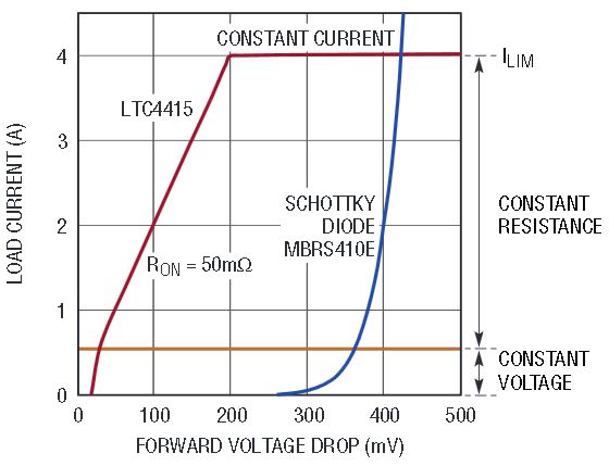 Figure 2. The LTC4415 I-V curve and regions of operation vs a typical Schottky diode.