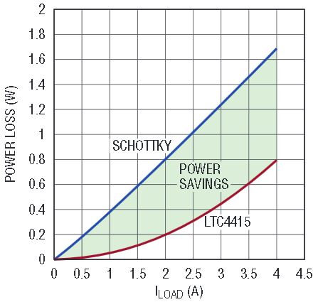 Figure 3. The LTC4415 dissipates only 800mW at 4A, which is over 50% lower than the 1700mW dissipated by a Schottky diode.