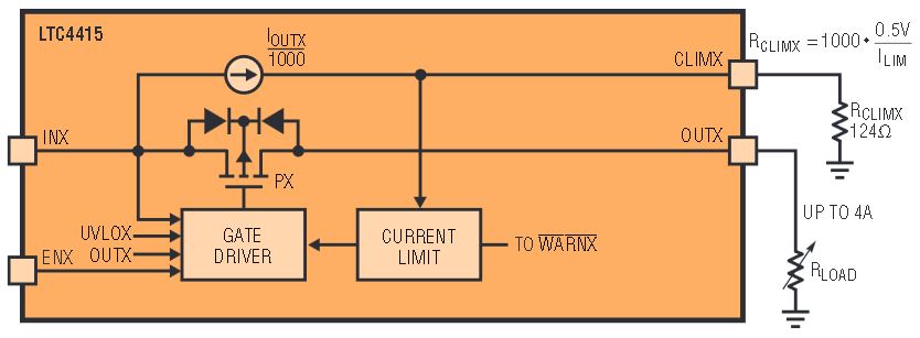 Another useful feature of the LTC4415 is short-circuit protection. The current limit of LTC4415 can be adjusted up to 4A with R1 and R2. Eliminating R1 and R2, and grounding CLIM1 and CLIM2, instead triggers the internal limit at 6A. Current limit is accomplished by a novel approach that allows the LTC4415 to both detect the load current and simultaneously produce a scaled analog voltage for load current monitoring across the same current limit resistor. Figure 4 shows a simplified block diagram. This eliminates series losses, and saves board space and BOM costs associated with a current sense resistor and amplifier circuit.