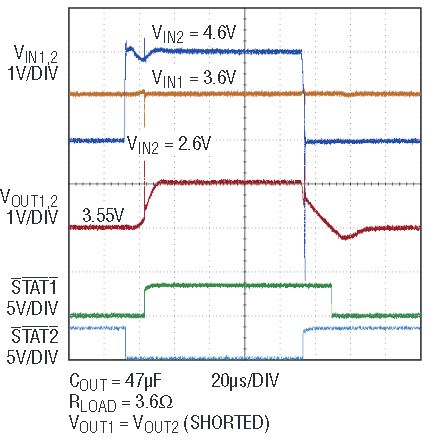 LTC4415 P-channel MOSFETs are optimized for minimal on-resistance with rapid switchover between sources without any appreciable load droop. Figure 5 shows the LTC4415 switching between input sources of different voltages, with only a 200mV transient dip and recovery within 20μs. Note that transient voltage spikes are usually caused by inductive connections. This can be reduced with short leads, proper layout technique, and input and output bypass capacitors with appropriate ESR.