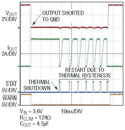 Thermal shutdown is triggered when die temperature exceeds 160°C. Figure 6 shows how these two signals reflect the system behavior when a path transitions back and forth between current limit and thermal shutdown. For about 25ms after the output is shorted, the current limit is active and WARNx stays low. Then STATx goes high as thermal shutdown is triggered. Restart occurs as the device cools below 140°C, but shuts down repeatedly due to the persistent short.