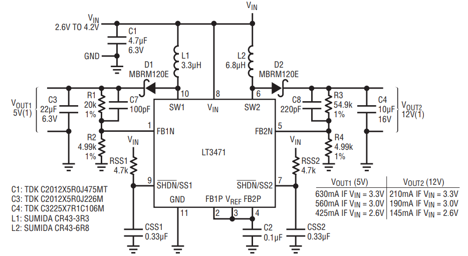 Consider the circuit in Figure 1. With a Li Ion battery input, this converter provides two positive supplies: a 5V output and a 12V output. Only one input filter capacitor is required. Both outputs are independently controlled, but the same clock runs both switchers to avoid any interference (beat frequency) between them.
