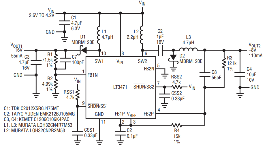 Op amps, CCD imagers, LCDs, medical diagnostic equipment and a host of other circuits require dual power supplies. Both supplies may be positive, both negative, or they may be opposite polarity. Dual supplies are implemented in a variety of ways, including using two converters, tapping off the switch with capacitors and diodes, or using multi-winding transformers. Each of these solutions adds unnecessary cost, size and complexity, especially now that there is a simple, single device solution available with the LT3471.