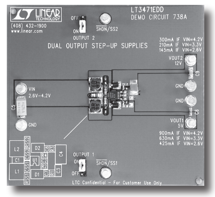 In situations where inrush current is a problem, the LT3471 contains a capacitor-programmable soft start feature that allows the designer to individually program the ramp rate of each output. Figure 3 shows a typical layout.