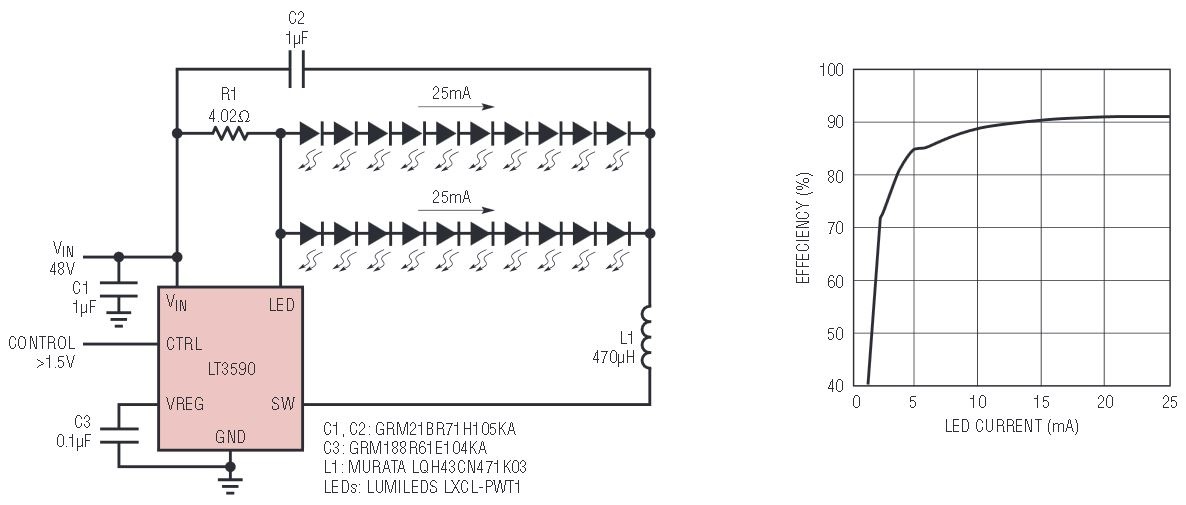 The high voltage rating of the LT3590 allows safe operation with a 48V input power supply. Figure 2 shows the LT3590 driving ten white LEDs from 48V input supply. Figure 4 shows another high voltage application for the LT3590. Here, two strings of ten white LEDs are driven at 25mA. In this example we rely on the fact that the voltage drop across each LED string is a sum of ten average LEDs. Differences in individual LEDs are averaged across the string. Reasonable current matching is expected in this scheme with better than 90% efficiency for a wide range of LED currents.