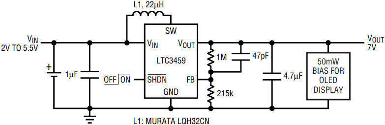 Figure 2. Powering a 7V, 50mW OLED from a 2V–5.5V input.