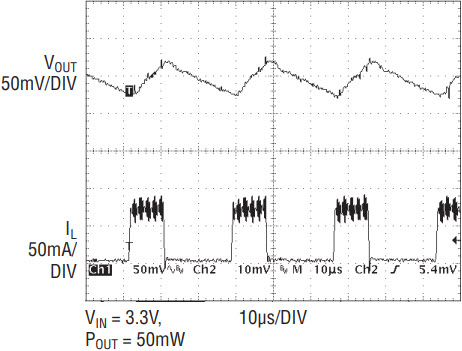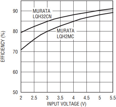 Figure 2 shows an application where the LTC3459 is used to provide a 7V, 50mW bias for an organic LED display (OLED). VOUT ripple (AC coupled) and inductor current waveforms are shown in Figure 3, where Figure 4 shows efficiencies of this application with a 2V–5.5V input. Efficiency was taken with two 22µH Murata inductors: one from the LQH2MC series (shown in Figure 1) and a slightly larger inductor from the LQH32CN series. The larger inductor gives about 5% better efficiency, due to lower DC resistance and losses in the core. Since the LTC3459 uses Burst Mode operation with only 10µA of quiescent current, the efficiencies shown in Figure 4 are relatively constant with load current down to 100µA. If the minimum input voltage is increased to 3V, a 100mW load can be supported in this application.