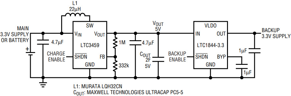 Figure 5. SuperCap-based backup supply using the LTC3459 and LTC1844.