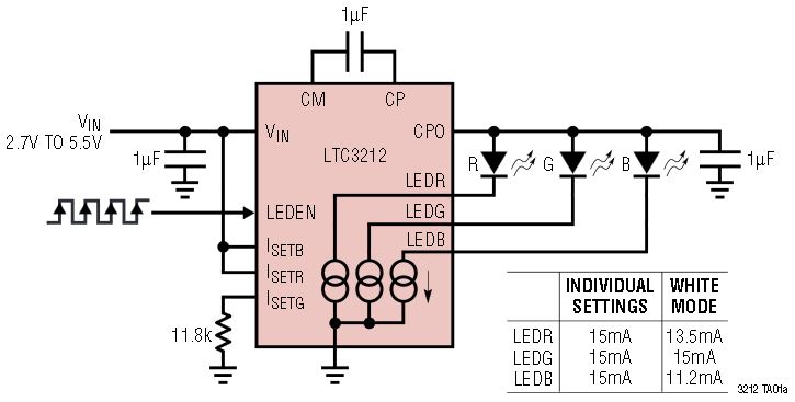 The LTC3212 is an RGB LED driver optimized to be a simple and compact solution for driving an RGB LED from a 2.7V to 5.5V supply. The LTC3212 is well suited for applications requiring an LED driver with accurate programmable current sources, and compact, low noise operation.