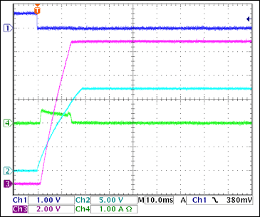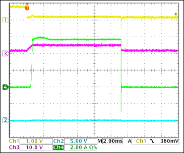 Ch1 = STAT2, Ch2 = VGATE (+5V), Ch3 = +5VOUT, Ch4 = IOUT(+5V) 0.5A/div
