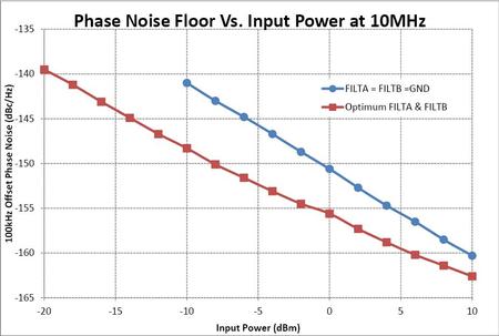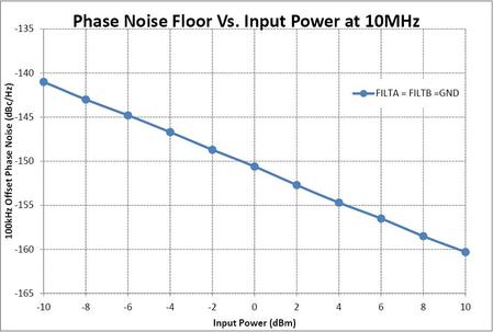 The following is the resulting phase noise floor as the amplitude of the input sinewave is varied over the specified input range of the LTC6957.
