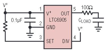 The LTC6905 uses an internal feedback loop to accurately match the impedance of a switched capacitor element to the external resistor connected to the RSET pin, thus setting the master oscillator frequency. The voltage level on the DIV pin engages internal dividers to divide this master frequency by 1, 2 or 4 before it is sent to the OUT pin. With fixed frequency devices, the LTC6905-XXX series of parts, the RSET pin is replaced by an output enable pin, which disables the output when it is connected to GND.