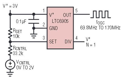 The LTC6905 is an ideal candidate for making a voltage or current controlled oscillator. Unlike other resistor controlled parts, where the voltage on RSET varies with power supply and temperature, the LTC6905 maintains the voltage at the RSET pin at 1V below the positive supply. Because the frequency of oscillation is based on the resistance, or V/I at the RSET pin, a stable V at the RSET pin provides the ability to generate an accurate output frequency by injecting an accurate current (I) at the RSET pin.