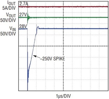 Similarly, the –250V spike test result is shown in Figure 9. In this condition, diode D1 is reverse biased during the –250V spike, blocking the spike from M2 and the output. D1 also provides reverse polarity protection, preventing negative input voltages from appearing at the output. (The LTC4366 surge stopper in front of D1 is capable of withstanding reverse voltages and the –250V spike without additional protection.)