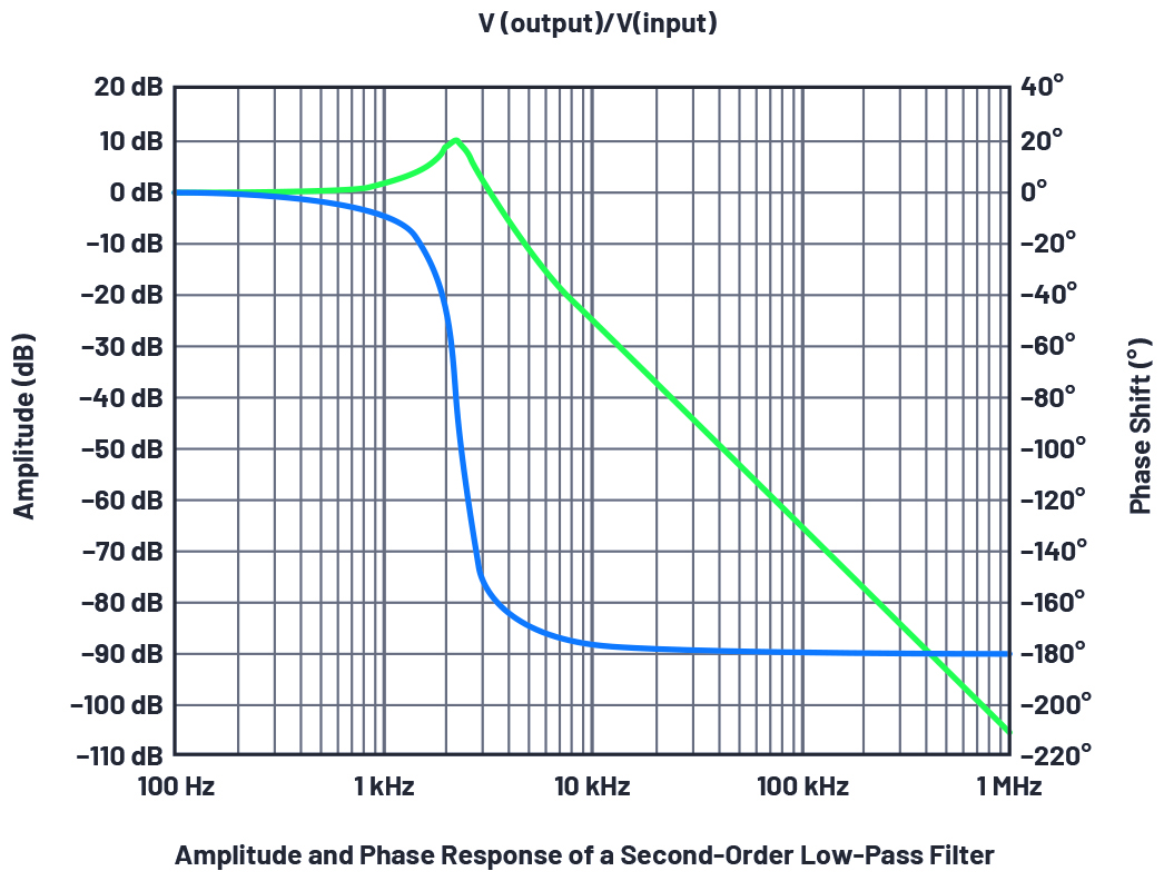 Figure 2 shows the frequency response of a second-order low-pass filter as a function of frequency. The amplitude gain is given in decibels on the y-axis on the left, and the phase shift is given in degrees on the y-axis on the right.