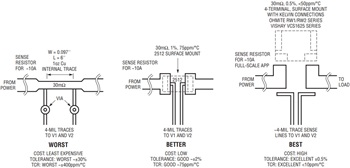 Copper has a relatively high temperature coefficient of resistance (TCR), with a value of ~3930ppm/K. The TCR of copper also changes with temperature. Assuming that the current through the sense resistor produces negligible self-heating over a –40°C to 85°C temperature range, the copper resistance changes about 50%. If the sense resistor does heat itself, there is a nonlinear current-to-voltage distortion in the measurement. For this reason, there are special sense resistors manufactured with low TCR values (Figure 13). If the temperature rise in the sense resistor is large due to large currents, even small TCRs can yield large measurement errors. The LTC2990 can be used to track the sense resistor temperature so its TCR can be compensated for, improving measurement accuracy.