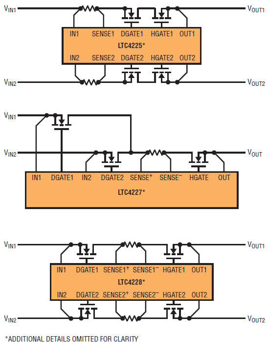 The family of products comprising the LTC4225, LTC4227 and LTC4228 minimize power loss by using external N-channel MOSFETs for pass elements, minimizing the voltage drop from the supply to the load when the MOSFETs are turned on. When an input source voltage drops below the output common supply voltage, the appropriate MOSFET is turned off, thereby matching the function and performance of an ideal diode.