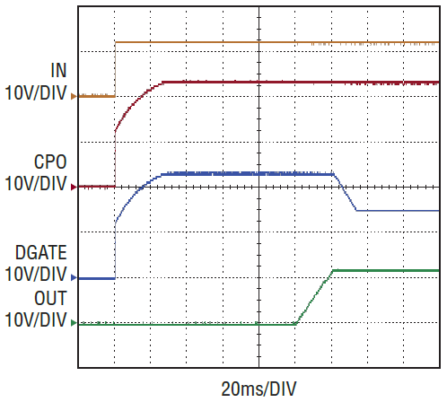 Figure 2. Ideal diode controller CPO and DGATE pull up when IN supply turns on.