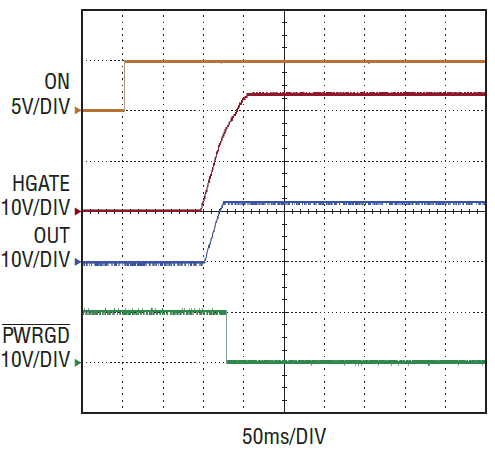 Figure 3. Hot Swap controller HGATE starts up and PWRGD pulls low after 100ms delay when ON toggles high.