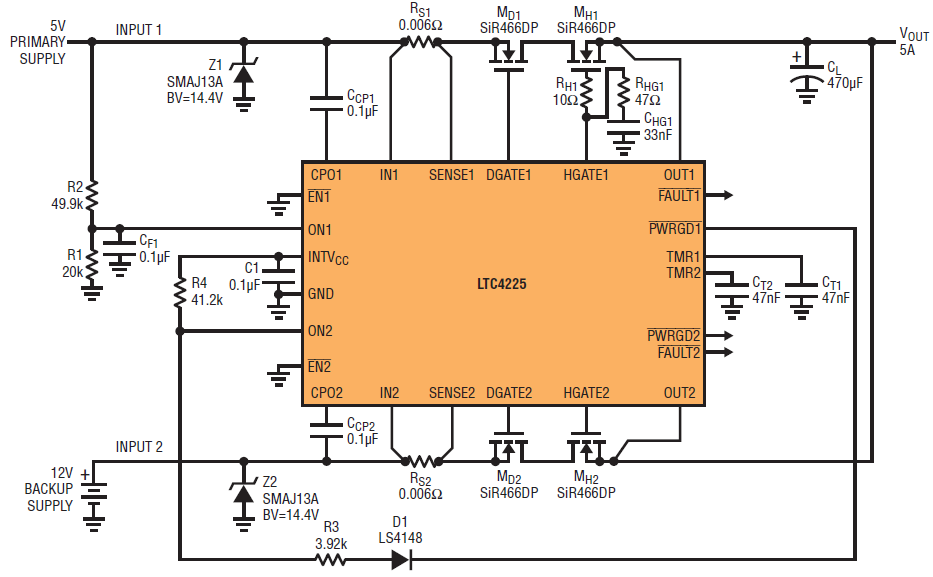 In a traditional diode-ORed multisupply system, the input supply with the higher voltage is passed to the output, while the lower voltage supply is shut out. This simple solution satisfies the needs of applications where the priority of the supplies is not simply a matter of the higher voltage supply winning. Figure 5 shows a backup supply system where the 5V primary supply (INPUT1) is passed to the output whenever it is available, while the 12V backup supply (INPUT2) is called on only when the primary supply fails to deliver.
