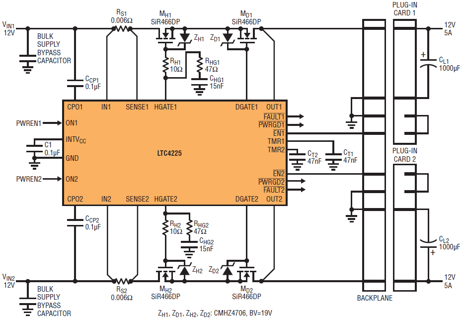Figure 4. The LTC4225 in a µTCA application to supply 12V power to two µTCA slots.