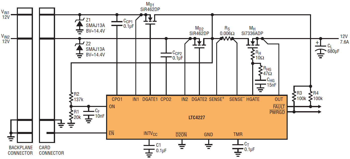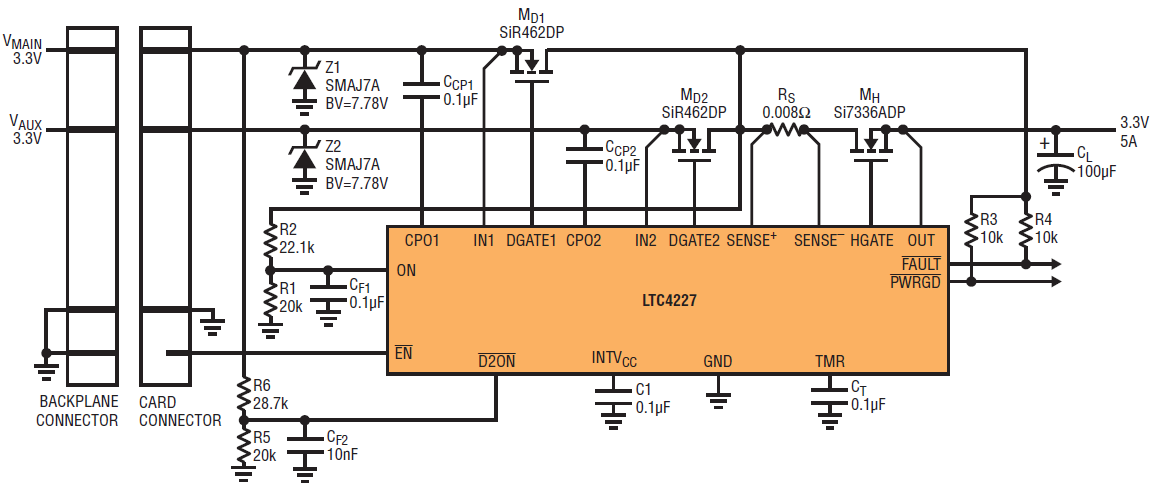Figure 7. LTC4227 for card-resident diode-OR application with Hot Swap control.