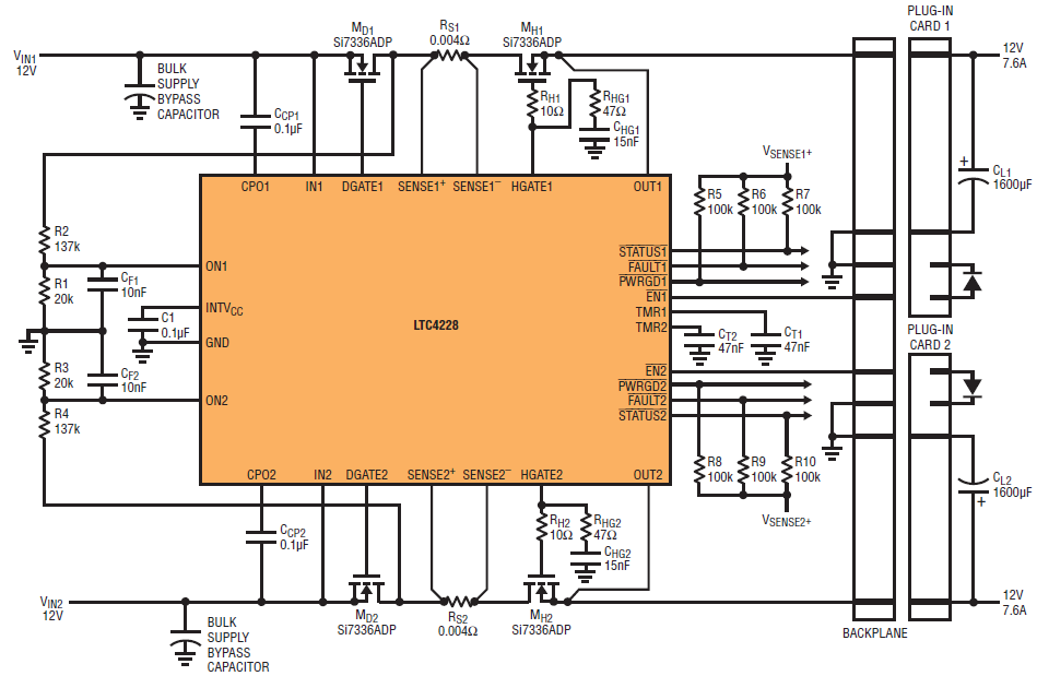 Figure 9. LTC4228 for µTCA application to supply 12V power to two µTCA slots.