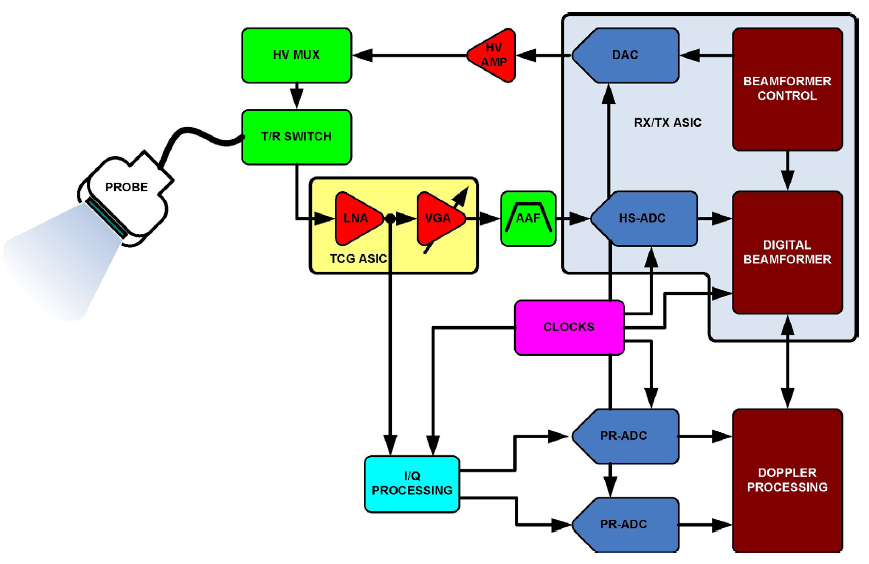 For many years, manufacturers implemented these complicated systems by designing their own custom application specific integrated circuits (ASICs). This solution usually consisted of two ASICs, which implemented most of the time-gain compression (TGC) and receive/transmit (Rx/Tx) paths, as shown in Figure 1.