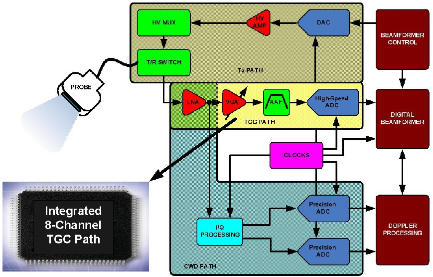Although high performance imaging can be achieved using this partitioning method, it is not optimal in terms of portability, size, and power consumption. The advent of quad-channel and octal-channel TGCs, ADCs, and DACs has allowed both the size and power to be reduced, but without compromising performance, thus bringing new system approaches and new players into these markets.