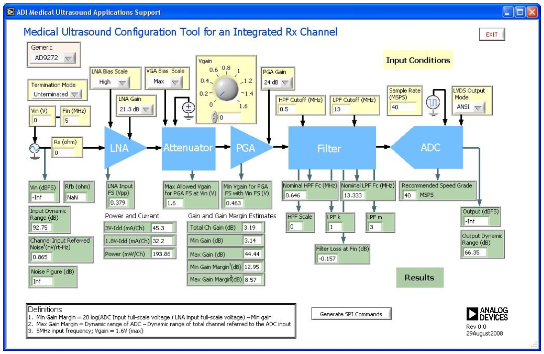 In a typical application, the system needs to acquire images from a 5-MHz probe producing a 0.5-Vpp signal. If the LNA that has 0.86 nV/√Hz of noise, or 1.4 nV/√Hz for the entire channel, and is source terminated with 50 ohms, the input dynamic range of the system would be 92 dB, thus producing a noise figure (NF) of 3.8 dB. This translates to an output dynamic range of 66.3 dB, allowing the system designer to maintain optimum performance while only dissipating 191 mW/channel at 40 MSPS.