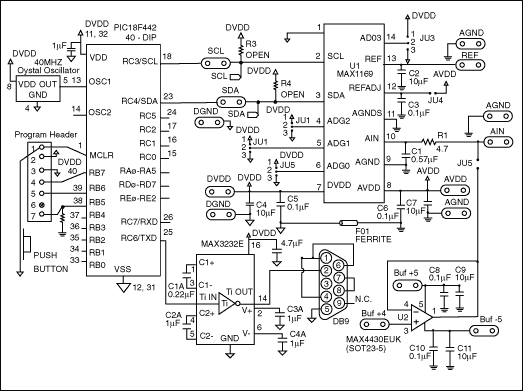 这里讨论的应用电路采用了MAX1169EVKIT,包括:MAX1169、输入缓冲器(MAX4430)和经过验证的PCB。PIC和RS-232收发器IC (MAX3232)没有安装在MAX1169EVKIT板上。但已添加到系统中,图1所示是一个完整的应用电路。MAX1169EVKIT上的SCL、SDA焊盘便于I²C兼容的串行接口的连接。400kHz I²C通信时,在R3和R4上接1.5kΩ上拉电阻。