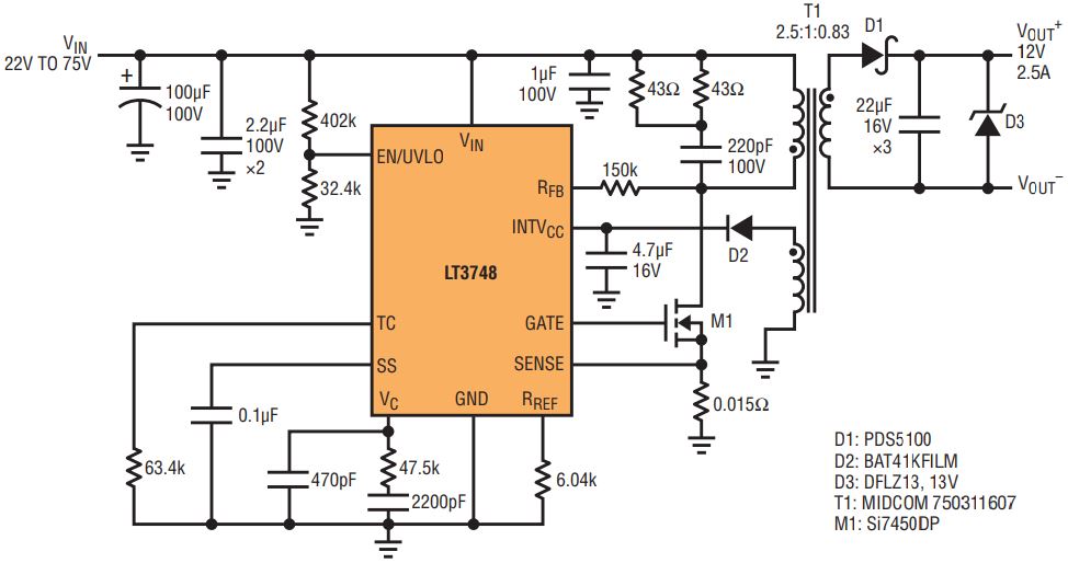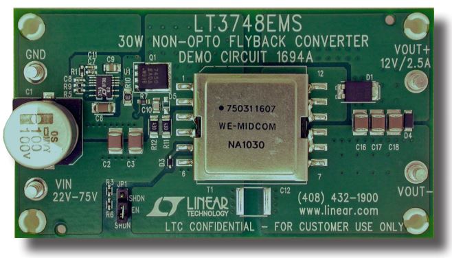 The LT3748 is a switching regulator controller specifically designed to simplify the design of isolated power supplies using a flyback topology. No third winding or opto-isolator is required as the LT3748 senses the isolated output voltage directly from the primary-side flyback waveform.