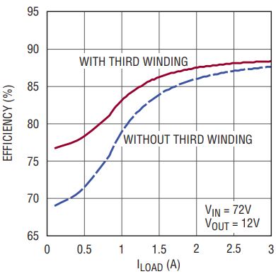 The LT3748 provides excellent output voltage regulation without the need for an opto-coupler or third winding, but for some applications with high input voltages, an additional winding may improve overall system efficiency, particularly at lighter loads. The third winding should be designed to output a voltage above 7.2V but never exceeding 20V. In typical applications over 15W, overdriving the INTVCC pin may improve efficiency by several percent at maximum load and more than 10% at light loads. Figure 4 shows the efficiency of the circuit in Figure 5 with and without the third winding connected.