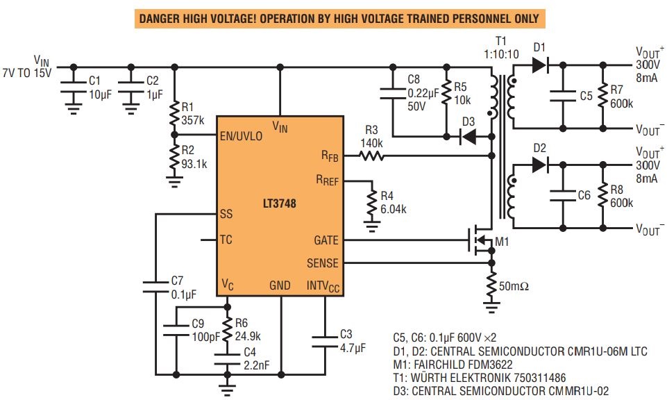 A flyback topology is often the only way to produce a high voltage isolated output for long cable runs or for powering interface equipment. Figure 7 shows a typical application for this style of application with complementary 300V outputs. For the low power levels in this application, an off-the-shelf EP13 transformer is more than sufficient and keeps the total solution size small.