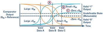 在一组比较器中,当比较器基准电压精确等于或极其接近待比较的电压时,便可能发生亚稳态状况(Kester,2006)。比较电压在幅度上越接近基准电压,比较器作出全面判断所需的时间就越长。如果二者之间的电压差非常小或为0,比较器可能没有足够的时间来最终判定比较电压是高于还是低于基准电压。当该样本的转换完成时,比较器输出可能处于亚稳第三态,而不是清晰地判定一个有效逻辑输出1或0 (Kester,2006)。这种犹豫不定会波及整个ADC,可能引起转换错误。