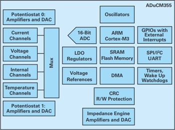 ADuCM355解决方案可以统一实施所有测量。这种高度集成的芯片包含一个节能模拟前端(AFE)和一个微控制器,后者承担管理和安全功能,例如循环冗余校验(CRC)。图4所示的框图显示了ADuCM355的关键组件。